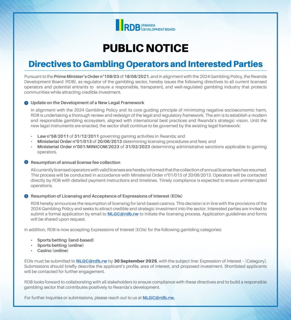 The move comes as part of the implementation of Rwanda’s new national gambling policy, adopted in 2024. The initiative seeks to ensure a safe, well-regulated, and economically beneficial gambling sector that aligns with modern digital and regulatory standards.